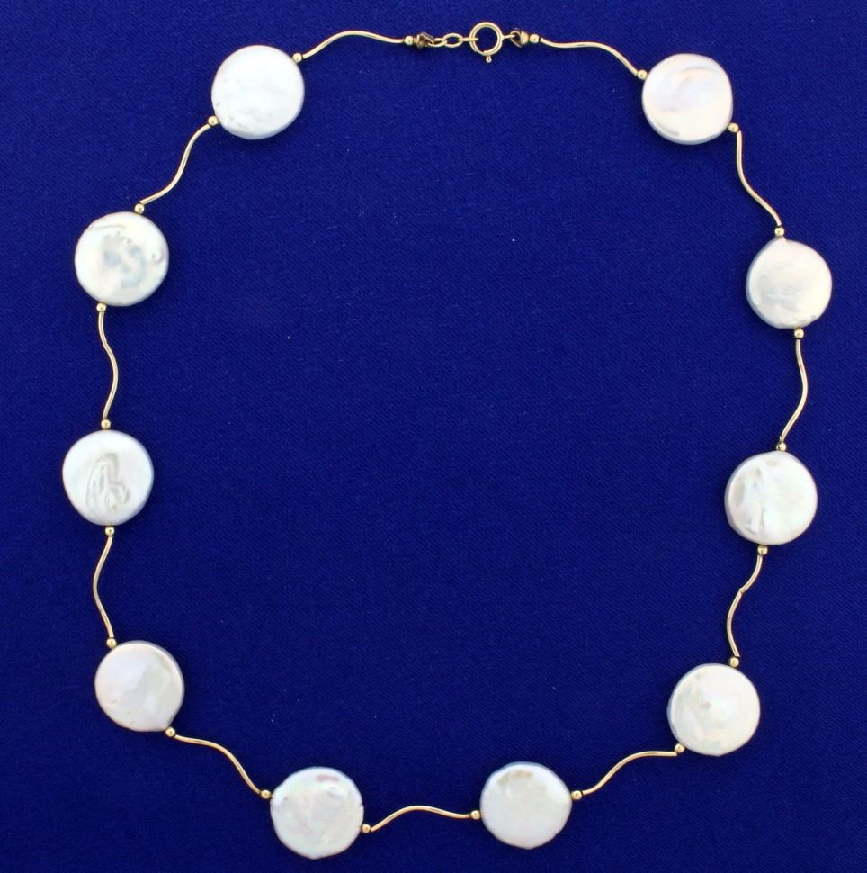 In 14k yellow gold. Contains ten 15-16mm mother of pearl gemstones with bright color flashes and high luster. 16 1/2" long. 19.5g.