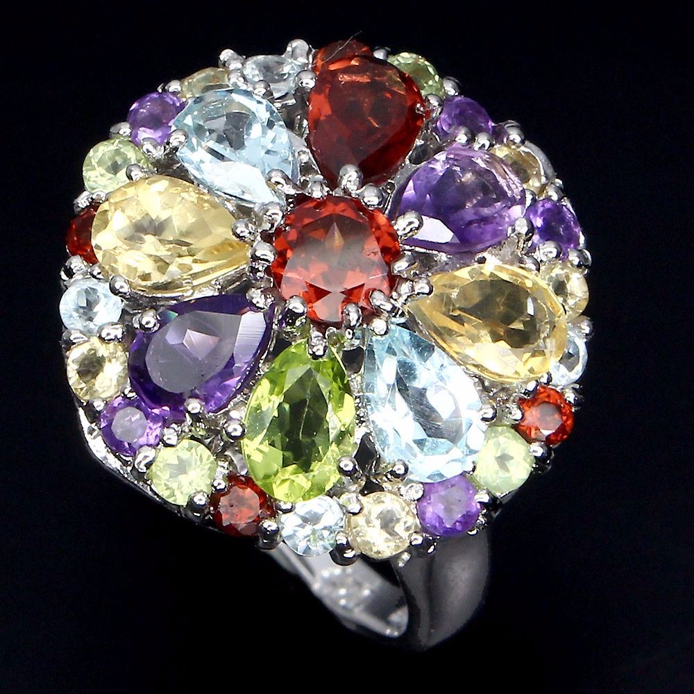 925 STERLING SILVER -14K WHITE GOLD Plated; RING SIZE- 8 (can be resized) MAIN STONE -MOZAMBIQUE GARNET; GEMS -AMETHYST,CITRINE,PERIDOT,SKY BLUE TOPAZ; TOTAL WEIGHT 30.75 CT (TOTAL WEIGHT OF SILVER + STONE) DIMENSION -* STONE 2.0 TO 6.0 X 4.0 MM. * FACE RING 20.0 MM. MAIN STONE SHAPE -ROUND CUT; MAIN STONE COLOR -TOP RICH RED; CLARITY/GRADE -IF TO VVS; TREATMENT -UNHEATED; ORIGIN -AFRICA; HARDNESS -6.5 - 8.0;