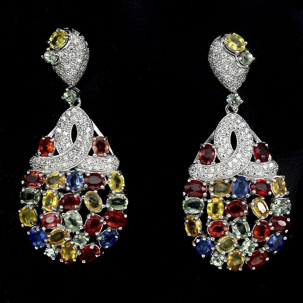 Natural Multi Color Fancy Sapphire Earrings .925 silver ;earrings.....925 STERLING SILVER.....14K WHITE GOLD Plated;MAIN STONE-SAPPHIRE;OTHER GEMS-CUBIC ZIRCONIA;TOTAL WEIGHT-49.89 CT (TOTAL WEIGHT OF SILVER + STONE)DIMENSION* STONE 2.0 TO 4.0 X 3.0 MM. * CZ 1.0 MM. * FACE EARRINGS 42.0 X 19.0 MM.MAIN STONE SHAPE-OVAL CUT;MAIN STONE COLOR-MULTI-COLOR;CLARITY/GRADEIF TO VVSLUSTERMESMERIZING;TREATMENT--UNHEATED;ORIGINSONGEA - AFRICAHARDNESS9