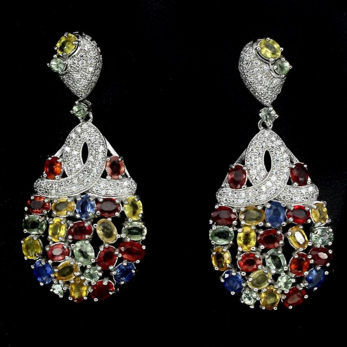 Natural Multi Color Fancy Sapphire Earrings .925 silver ;earrings.....925 STERLING SILVER.....14K WHITE GOLD Plated;MAIN STONE-SAPPHIRE;OTHER GEMS-CUBIC ZIRCONIA;TOTAL WEIGHT-49.89 CT (TOTAL WEIGHT OF SILVER + STONE)DIMENSION* STONE 2.0 TO 4.0 X 3.0 MM. * CZ 1.0 MM. * FACE EARRINGS 42.0 X 19.0 MM.MAIN STONE SHAPE-OVAL CUT;MAIN STONE COLOR-MULTI-COLOR;CLARITY/GRADEIF TO VVSLUSTERMESMERIZING;TREATMENT--UNHEATED;ORIGINSONGEA - AFRICAHARDNESS9