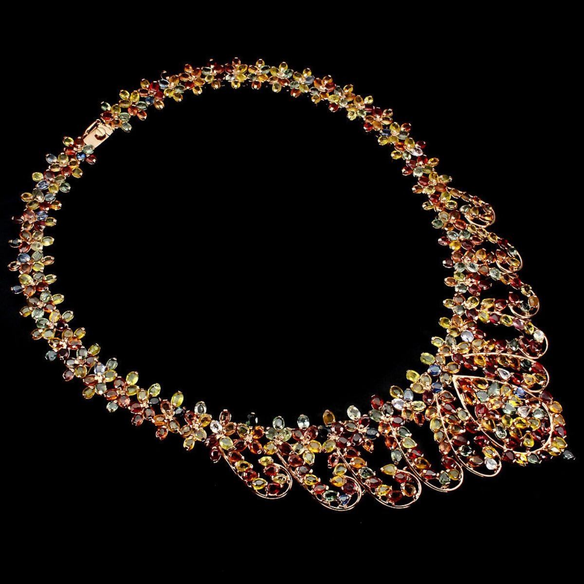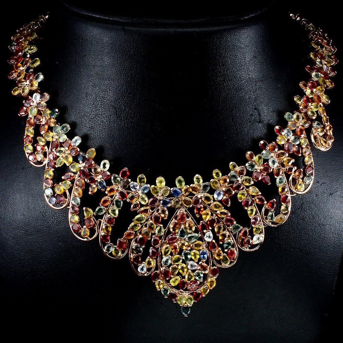 925 STERLING SILVER... PLATE -14K ROSE GOLD. LENGTH (INCHES) 16. MAIN STONE -SAPPHIRE. TOTAL WEIGHT -582.30 CT (TOTAL WEIGHT OF SILVER + STONE) DIMENSION * STONE 4.0 X 3.0 TO 5.0 X 3.0 MM. * STONES PART LENGTH 410.0 X 57.0 MM.. MAIN STONE SHAPE -OVAL CUT. MAIN STONE COLOR -MULTI-COLOR.; CLARITY/GRADE -IF TO VVS; LUSTER -WONDERFUL; ORIGIN - AFRICA; HARDNESS -9.0