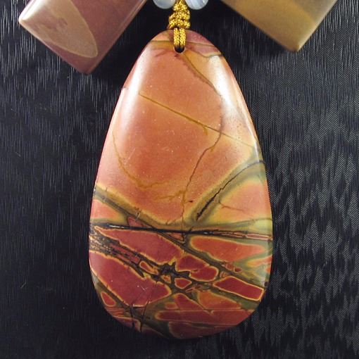 Stone Name Multi-Color Picasso *Stone Overall Dimension for each bead 55x33x7 mm (2.165x1.299x0.276 inch ) *Weight 520 ct/ 104 g/ 3.668496 ozOther Stones used in this Necklace Wonderstone*Center Stone Properties *Locality unknown *Appearance opaque *Color Red green - yellow Orange *Mohs Hardness 6 *Source Natural *Treatments None *Drilled YES diameter 2.5/36-3/36 inch *Other Names~~~~~~~~~(+) Each step of our Lapidary work is under tight quality control . With the best pattern-color combination possible in mind the initial cut was done by experienced lapidary ... The last-step diamond polishing makes the surface of each bead/cab mirror-like glossy that meet the highest standard possible. Finally only those met all quality requirements are selected.