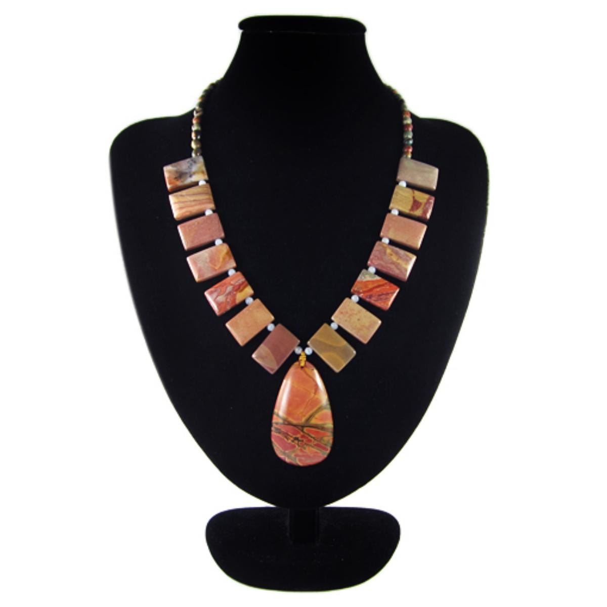 Stone Name Multi-Color Picasso *Stone Overall Dimension for each bead 55x33x7 mm (2.165x1.299x0.276 inch ) *Weight 520 ct/ 104 g/ 3.668496 ozOther Stones used in this Necklace Wonderstone*Center Stone Properties *Locality unknown *Appearance opaque *Color Red green - yellow Orange *Mohs Hardness 6 *Source Natural *Treatments None *Drilled YES diameter 2.5/36-3/36 inch *Other Names~~~~~~~~~(+) Each step of our Lapidary work is under tight quality control . With the best pattern-color combination possible in mind the initial cut was done by experienced lapidary ... The last-step diamond polishing makes the surface of each bead/cab mirror-like glossy that meet the highest standard possible. Finally only those met all quality requirements are selected.