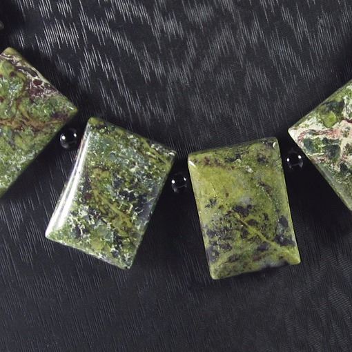 Stone Name Rhyolite *Stone Overall Dimension for each bead 43x38x7 mm (1.693x1.496x0.276 inch ) *Weight 480 ct/ 96 g/ 3.386304 ozOther Stones used in this Necklace African Bloodstone*Center Stone Properties *Locality Australia *Appearance opaque *Color green - yellow *Mohs Hardness 5 *Source Natural *Treatments None *Drilled YES diameter 2.5/36-3/36 inch *Other Names~~~~~~~~~(+) Each step of our Lapidary work is under tight quality control . With the best pattern-color combination possible in mind the initial cut was done by experienced lapidary ... The last-step diamond polishing makes the surface of each bead/cab mirror-like glossy that meet the highest standard possible. Finally only those met all quality requirements are selected.