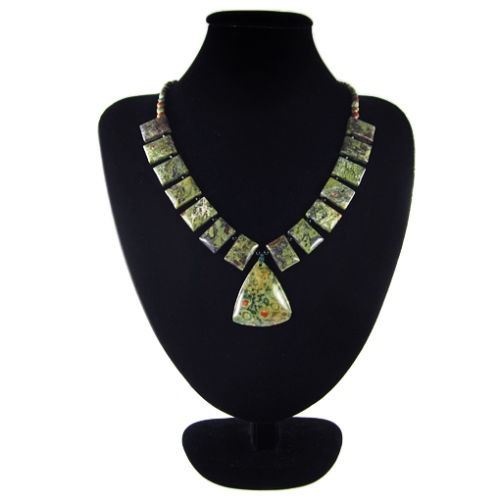 Stone Name Rhyolite *Stone Overall Dimension for each bead 43x38x7 mm (1.693x1.496x0.276 inch ) *Weight 480 ct/ 96 g/ 3.386304 ozOther Stones used in this Necklace African Bloodstone*Center Stone Properties *Locality Australia *Appearance opaque *Color green - yellow *Mohs Hardness 5 *Source Natural *Treatments None *Drilled YES diameter 2.5/36-3/36 inch *Other Names~~~~~~~~~(+) Each step of our Lapidary work is under tight quality control . With the best pattern-color combination possible in mind the initial cut was done by experienced lapidary ... The last-step diamond polishing makes the surface of each bead/cab mirror-like glossy that meet the highest standard possible. Finally only those met all quality requirements are selected.