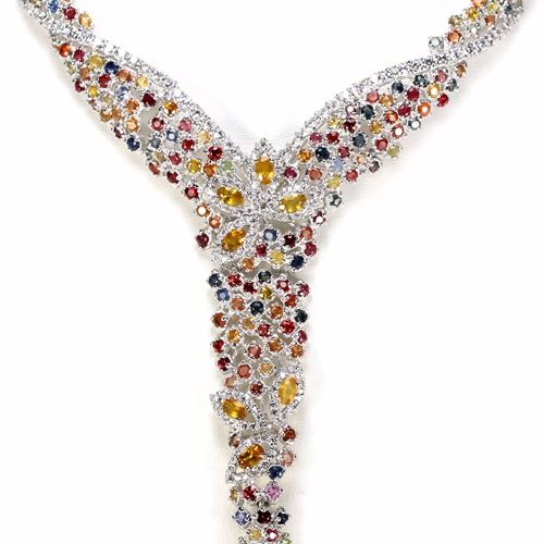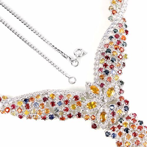 Natural MULTI COLOR SAPPHIRE CZ 925 SILVER NECKLACE 14K WHITE GOLD COATING; LENGTH OF ITEM (Inch.) 18.00 ; STONE SHAPE -OVAL ROUND; STONE DIMENSION -5 X 3 MM. , 2.5 MM. , 2.2 MM. , 2 MM.; ITEM WEIGHT -34.2 GRAM; COLOR -MULTI COLOR; CLARITY -VS-SI TRANSLUCENT LUSTER -SPECTACULAR; TREATMENT -HEATED; ORIGIN OF STONE- AFRICA THAILAND; HARDNESS- 9; WHITE CUBIC ZIRCONIA - 2.5 MM. , 1.3 MM.
