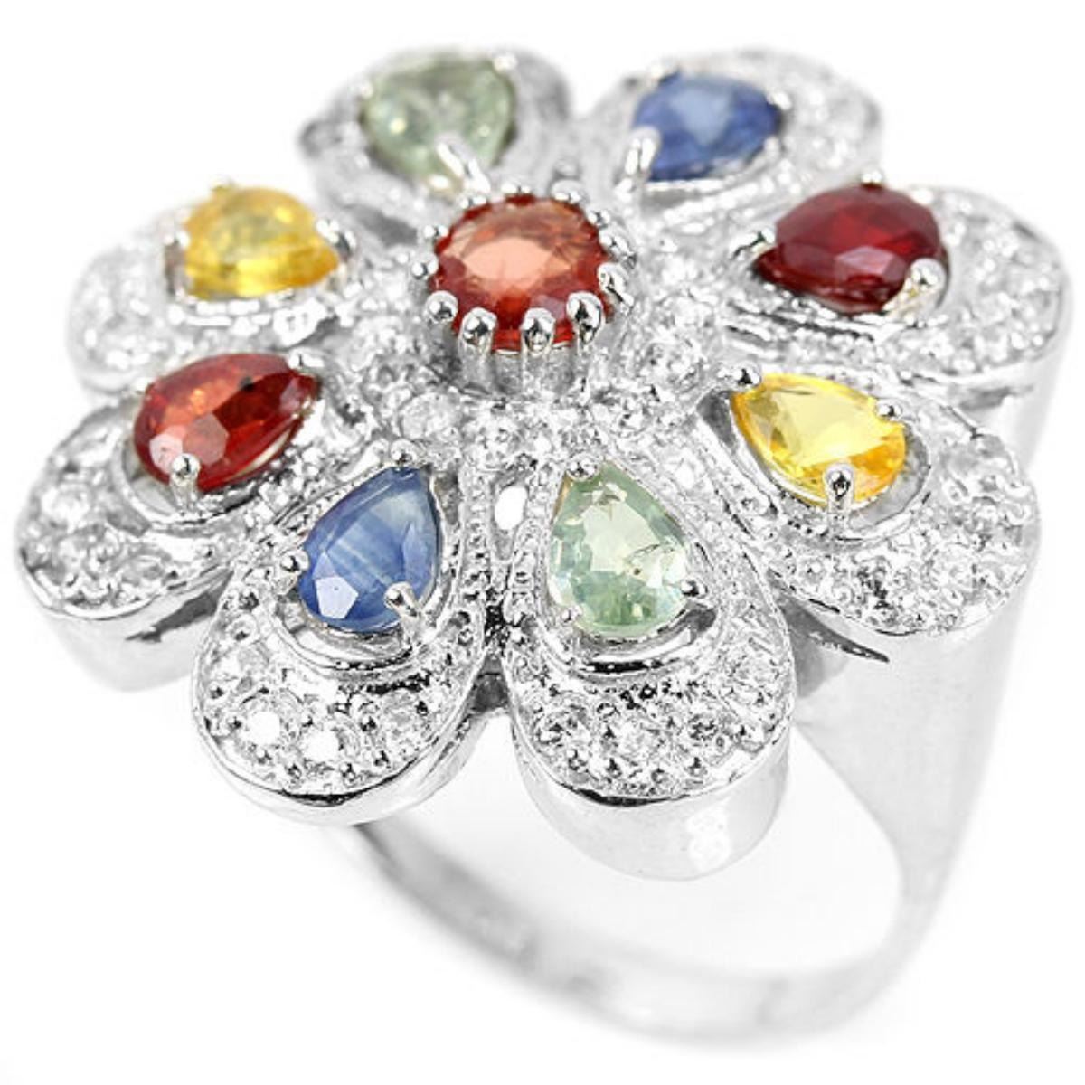 Natural MULTI COLOR SAPPHIRE CZ 925 SILVER RING 14K WHITE GOLD COATING; RING SIZE - 6.50 ( can be resized ) ITEM QUANTITY 1; STONE SHAPE -PEAR ROUND FACET CUT; STONE DIMENSION -4 X 3 MM. 4 MM.; ITEM WEIGHT -6.4 GRAM; COLOR -MULTI COLOR; CLARITY -VVS - VS;; LUSTER -DAZZLING; TREATMENT -HEATED; ORIGIN OF STONE -AFRICA; HARDNESS -9.0; FACE OF RING-- 23 X 23 MM. ; WHITE CUBIC ZIRCONIA -1.3 MM.;