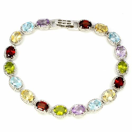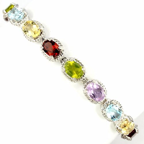 AMETHYST, MOZAMBIQUE GARNET, PERIDOT, CITRINE & SKY BLUE TOPAZ (NATURAL) 14K WHITE GOLD COATING 925 SILVER BRACELETUNIT OF ITEM (S):1 PIECEWEIGHT (CT.):71.27 CT. (total weight of silver + stone)DIMENSION:* STONE 7.0 X 5.0 MM. * LENGTH 7.5 INCHES. * FACE BRACELET 170.0 X 7.0 MM.SHAPE/CUT:OVAL FACETCOLOR:TOP FANCY COLORSCLARITY/GRADE:IF TO VVSLUSTER:GORGEOUSTREATMENT:UNHEATED & HEATEDORIGIN:BRAZIL, AFRICA & PAKISTANHARDNESS:6.5 - 8.0