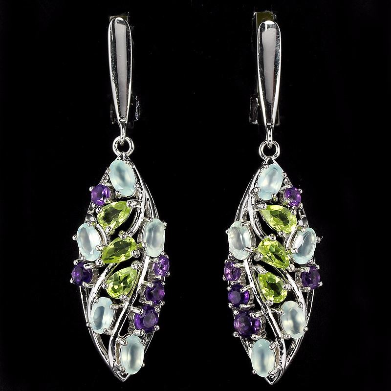 GENUINE CHALCEDONY PERIDOT & AMETHYST 925 SILVER EARRING 14K WHITE GOLD COATING; STONE SHAPEMIXED SHAPE;STONE DIMENSION5 X 3 MM. , 3.5 MM. , 3 MM. & 2.5 MM.;ITEM WEIGHT-8.8 GRAM;COLORMULTI COLOR;CLARITYIF, VVS - VS;LUSTER-DELIGHTFUL;TREATMENT- UNHEATED;ORIGIN OF STONEBRAZIL & AFRICA;HARDNESS6.5 - 7.0;OTHERFACE OF EARRING 46 X 12 MM.