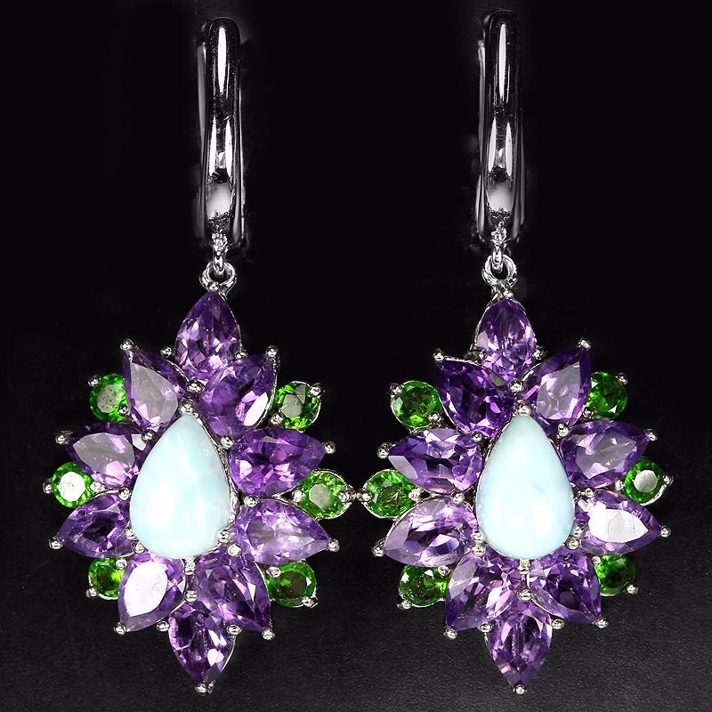 REAL LARIMAR AMETHYST ,CHROME DIOPSIDE 925 SILVER EARRING 14K WHITE GOLD COATING; STONE SHAPEPEAR & ROUNDSTONE DIMENSION9 X 6 MM. , 6 X 4 MM. , 3 MM.ITEM WEIGHT10.1 GRAMCOLORMULTI COLORCLARITYOPAQUE & IF TO VVSLUSTERRAVISHINGTREATMENTNATURAL UNHEATEDORIGIN OF STONEDOMINICAN, RUSSIA & BRAZILHARDNESS5 - 7OTHERFACE OF EARRING 40 X 20 MM.