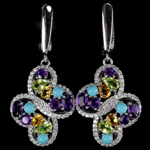 REAL TURQUOISE AMETHYST CITIRNE PERIDOT 925SILVER EARRING 14K WHITE GOLD COATING; STONE SHAPEMIXED SHAPESTONE DIMENSION5 X 3 MM. , 4 X 3 MM. 3 MM.ITEM WEIGHT5.62 CARATCOLORMULTI COLORCLARITYIF-VVS OPAQUELUSTERALLURINGTREATMENTUNHEATEDORIGIN OF STONEARIZONA, BRAZIL ASIAHARDNESS5.0 - 7.0OTHERFACE OF EARRING 40 X 18 MM. WHITE CUBIC ZIRCONIA 1 MM. TOTAL 9.10 G.