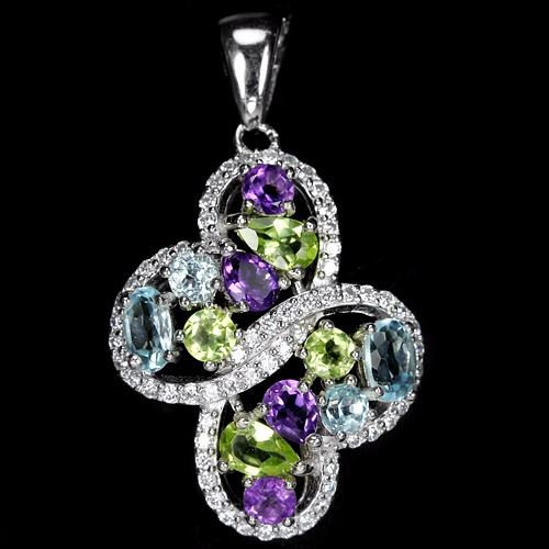 GENUINE AMETHYST PERIDOT TOPAZ & CZ 925 SILVER PENDANT 14K WHITE GOLD COATING; STONE SHAPEMIXED SHAPESTONE DIMENSION5 X 3 MM. , 4 X 3 MM. & 3 MM.ITEM WEIGHT3.3 GRAMCOLORMULTI COLORCLARITYIF - VVSLUSTERDAZZLINGTREATMENTUNHEATED & IRRADIATIONORIGIN OF STONEBRAZIL, ASIA & AFRICAHARDNESS6.5 - 8.0OTHERFACE OF PENDANT 31 X 18 MM. WHITE CUBIC ZIRCONIA 1 MM.