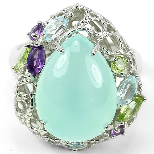 REAL CHALCEDONY AMETHYST PERIDOT TOPAZ 925 SILVER RING 14K WHITE GOLD COATING; RING SIZE, LENGTH OF ITEM (Inch.)9.00 ( can be resized )ITEM QUANTITY1STONE SHAPEPEAR CABOCHON CUT;STONE DIMENSION16 X 12 MM.;MAIN STONE WEIGHT10 CARAT;COLORLAVENDER BLUE;CLARITYTRANSLUCENT';LUSTERENCHANTING;TREATMENT-NATURAL UNHEATED;ORIGIN OF STONEAFRICA;HARDNESS7;OTHERFACE OF RING 22 X 20 MM.; MULTI COLOR GEMSTONE 5 X 2.5 MM. , 2.5 MM. ;TOTAL 7 G.
