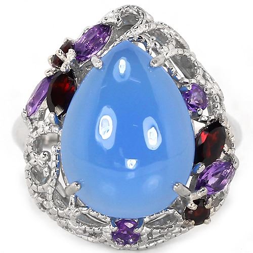 MULTI COLOR CHALCEDONY AMETHYST GARNET 925 SILVER RING 14K WHITE GOLD COATING...STONE SHAPEPEAR CABOCHON CUT.....STONE DIMENSION16 X 12 MM.;MAIN STONE WEIGHT10 CARAT;COLORLAVENDER BLUE;CLARITYTRANSLUCENT;LUSTERFASCINATING;TREATMENTNATURAL UNHEATED;ORIGIN OF STONEAFRICA;HARDNESS7;OTHERFACE OF RING 22 X 20 MM.; AMETHYST & GARNET 5 X 2.5 MM. , 2.5 MM. ;TOTAL 7.1 G.