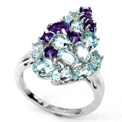 AMETHYST & SKY BLUE TOPAZ (NATURAL) 14K WHITE GOLD COATING 925 SILVER RING.........UNIT OF ITEM (S):1 PIECE;WEIGHT (CT.):27.53 CT. (total weight of silver + stone)DIMENSION:* STONE 3.0 TO 7.0 X 5.0 MM. * RING SIZE 7.0 * FACE RING 26.0 X 17.0 MM.SHAPE/CUT:OVAL, PEAR & ROUND FACET;COLOR:TOP INTENSE PURPLE & TOP SKY BLUE';CLARITY/GRADE:IF TO VVS;LUSTER:GORGEOUS;TREATMENT:UNHEATED & HEATED;ORIGIN:URUGUAY & AFRICA;