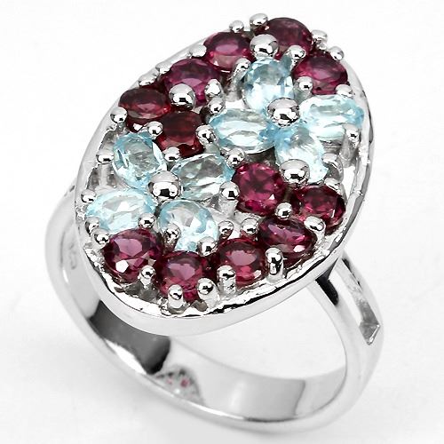 RHODOLITE GARNET & SKY BLUE TOPAZ (NATURAL) 14K WHITE GOLD COATING 925 SILVER RING;UNIT OF ITEM (S):1 PIECE;WEIGHT (CT.):39.45 CT. (total weight of silver + stone);DIMENSION:* STONE 3.5 TO 4.0 X 3.0 MM. * RING SIZE 9.0; * FACE RING 23.0 X 16.0 MM.;SHAPE/CUT:OVAL & ROUND FACET;COLOR:TOP RICH PINK RASPBERRY & TOP SKY BLUE;CLARITY/GRADE:IF TO VVS;LUSTER:GORGEOUS;TREATMENT:UNHEATED & HEATED;ORIGIN:AFRICA;HARDNESS:7.0 - 8.0