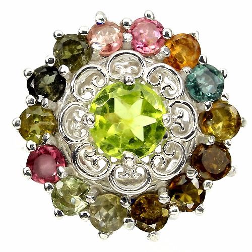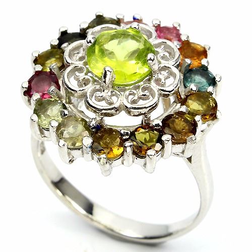 PERIDOT & TOURMALINE (NATURAL) 14K WHITE GOLD COATING 925 SILVER RINGUNIT OF ITEM (S):1 PIECE;WEIGHT (CT.):31.83 CT. (total weight of silver + stone)DIMENSION:* STONE 4.0 TO 7.0 MM. * RING SIZE 9.5 * FACE RING 22.0 MM.SHAPE/CUT:ROUND FACETCOLOR:TOP FANCY COLORSCLARITY/GRADE:IF TO VVS & TRANSPARENTLUSTER:GORGEOUSTREATMENT:UNHEATEDORIGIN:PAKISTAN & BRAZILHARDNESS:6.5 - 7.5