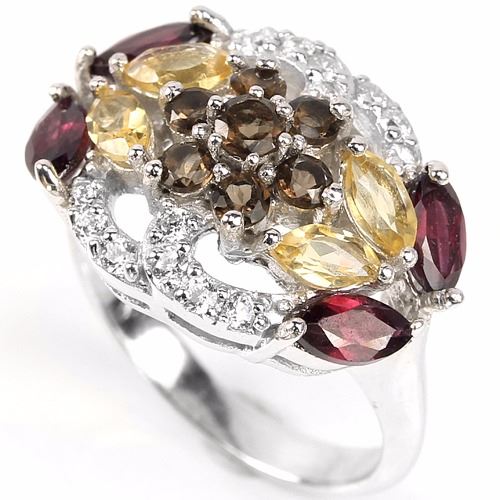 NATURAL SMOKY QUARTZ, CITRINE, GARNET & CZ 925SILVER RING 14K WHITE GOLD COATING...size 7; STONE SHAPEROUND & MARQUISE PORTUGESE CUTSTONE DIMENSION6 X 3 MM. , 5 X 2.5 MM. , 3 MM. & 2.2 MM.MAIN STONE WEIGHT1.78 CARATCOLORMULTI COLORCLARITYIF - VVSLUSTERENCHANTINGTREATMENTUNHEATEDORIGIN OF STONEBRAZIL & CAMBODIAHARDNESS7.0 - 7.5OTHERFACE OF RING 20 X 15 MM. WHITE CUBIC ZIRCONIA 1.5 MM. TOTAL 5.55 G.