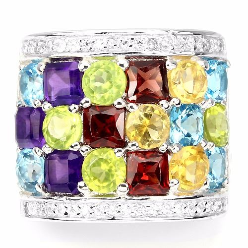 AMETHYST, MOZABIQUE GARNET, PERIDOT, CITRINE, TOPAZ (NATURAL) & CUBIC ZIRCONIA 14K WHITE GOLD PLATED 925 SILVER RING;UNIT OF ITEM (S):1 PIECE;WEIGHT (CT.):43.38 CT. (total weight of silver + stone);DIMENSION:* STONE 4.0 MM. * CZ 1.0 MM. * RING SIZE 8.0 * FACE RING 20.0 X 18.0 MM.;SHAPE/CUT:CUSHION, SQUARE, ROUND FACET & ROUND DIAMOND CUT;COLOR:TOP FANCY COLORS & AAA WHITE;CLARITY/GRADE:IF TO VVS;LUSTER:GORGEOUS;TREATMENT:UNHEATED & HEATED;ORIGIN:URUGUAY, PAKISTAN, AFRICA & BRAZIL;HARDNESS:6.5 - 8.0