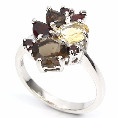 SMOKY QUARTZ, MOZAMBIQUE GARNET & CITRINE (NATURAL) 14K WHITE GOLD PLATED 925 SILVER RING;UNIT OF ITEM (S):1 PIECE;WEIGHT (CT.):19.38 CT. (total weight of silver + stone);DIMENSION:* STONE 2.5 TO 7.0 MM. * RING SIZE 7.5 * FACE RING 18.0 X 13.0 MM.SHAPE/CUT:ROUND, PEAR & OVAL FACET;COLOR:TOP FANCY COLORSCLARITY/GRADE:IF TO VVSLUSTER:BEWITCHINGTREATMENT:UNHEATEDORIGIN:BRAZIL & AFRICAHARDNESS:7.0 - 7.5