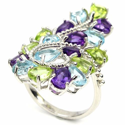 AMETHYST, PERIDOT & SKY BLUE TOPAZ (NATURAL) 14K WHITE GOLD COATING 925 SILVER RINGUNIT OF ITEM (S):1 PIECEWEIGHT (CT.):32.82 CT. (total weight of silver + stone)DIMENSION:* STONE 6.0 X 4.0 MM. * RING SIZE 7.0 * FACE RING 38.0 X 19.0 MM.SHAPE/CUT:PEAR FACETCOLOR:TOP FANCY COLORSCLARITY/GRADE:IF TO VVSLUSTER:BEWITCHINGTREATMENT:UNHEATED & HEATEDORIGIN:URUGUAY, PAKISTAN & AFRICAHARDNESS:6.5 - 8.0