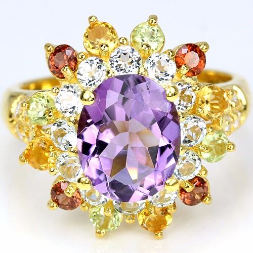 AMETHYST GARNET CITRINE PERIDOT TOPAZ CZ 925 SILVER RING 14K YELLOW GOLD COATING; RING SIZE, LENGTH OF ITEM (Inch.)7.00 ( can be resized )ITEM QUANTITY1STONE SHAPEOVAL PORTUGESE CUTSTONE DIMENSION10 X 8 X 4.8 MM.ITEM WEIGHT3.85 CARATCOLORPURPLECLARITYIFLUSTERGORGEOUSTREATMENTUNHEATEDORIGIN OF STONEBRAZILHARDNESS7.0OTHERFACE OF RING 17 X 17 MM. MULTI COLOR GEMSTONE 2.5 MM. WHITE CUBIC ZIRCONIA 1.5 MM. TOTAL 5.27 G.