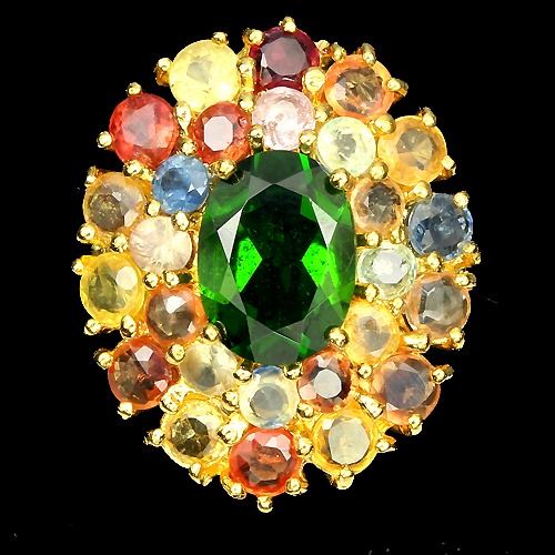 CHROME DIOPSIDE & FANCY SAPPHIRE (NATURAL) 2-TONE BLACK RHODIUM & 14K YELLOW GOLD COATING 925 SILVER RING;UNIT OF ITEM (S):1 PIECE;WEIGHT (CT.):23.61 CT. (total weight of silver + stone)DIMENSION:* STONE 2.5 TO 8.0 X 6.0 MM. * RING SIZE 6.0 * FACE RING 19.0 X 16.0 MM.;SHAPE/CUT:OVAL & ROUND FACET;COLOR:TOP FANCY COLORS;CLARITY/GRADE:IF TO VVS & TRANSPARENT;LUSTER:GORGEOUS;TREATMENT:UNHEATED & HEATED;ORIGIN:RUSSIA, SONGEA - AFRICA & AFRICAHARDNESS:5.0 - 9.0