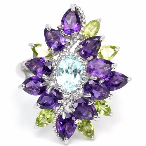 GENUINE AAA TOPAZ AMETHYST & PERIDOT 925 SILVER RING 14K WHITE GOLD COATING; STONE SHAPEPEAR & OVAL............size 8.....can be resizedSTONE DIMENSION7 X 5 MM. , 6 X 4 MM. & 5 X 3 MM.ITEM WEIGHT7.16 GRAMCOLORMULTI COLORCLARITYIF TO VVSLUSTERBEAUTEOUSTREATMENTNATURAL UNHEATEDORIGIN OF STONEAFRICA, BRAZIL & ASIAHARDNESS6.5 - 8OTHERFACE OF RING 45 X 24 MM.