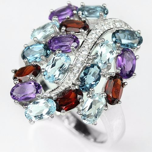 GENUINE TOPAZ GARNET AMETHYST & CZ 925 SILVER RING 14K WHITE GOLD COATING; STONE SHAPEOVAL PORTUGUESE CUT.......ring size 8;STONE DIMENSION5 X 3 MM.ITEM WEIGHT5.68 CARATCOLORMULTI COLORCLARITYIF - VVSLUSTERALLURINGTREATMENTIRRADIATION & UNHEATEDORIGIN OF STONEAFRICA, CAMBODIA & BRAZILHARDNESS7.0 - 8.0OTHERFACE OF RING 23 X 19 MM. WHITE CUBIC ZIRCONIA 1 MM. TOTAL 5.50 G.