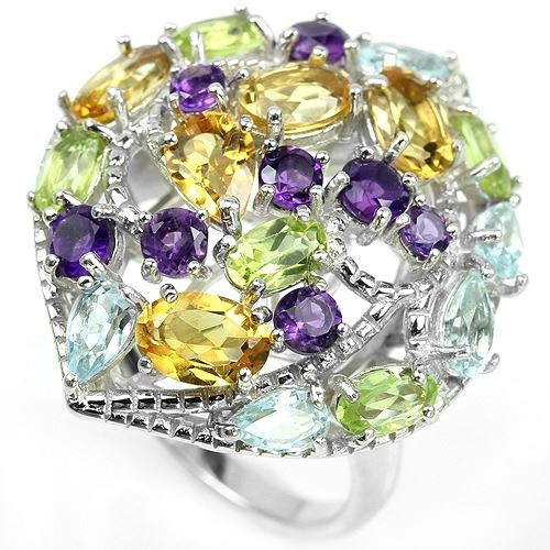 GENUINE AMETHYST PERIDOT CITRINE TOPAZ 925 SILVER RING 14K WHITE GOLD COATING...size 8.75; STONE SHAPEMIXED SHAPESTONE DIMENSION6 X 4 MM. , 5 X 3 MM. , 3.2 MM. , 2.7 MM. 2.2 MM.MAIN STONE WEIGHT6.14 CARAT;COLORMULTI COLORCLARITYIF - VVSLUSTERDAZZLINGTREATMENTUNHEATED IRRADIATIONORIGIN OF STONEASIA, BRAZIL AFRICAHARDNESS6.5 - 8.0OTHERFACE OF RING 27 X 24 MM. TOTAL 7.9 G.