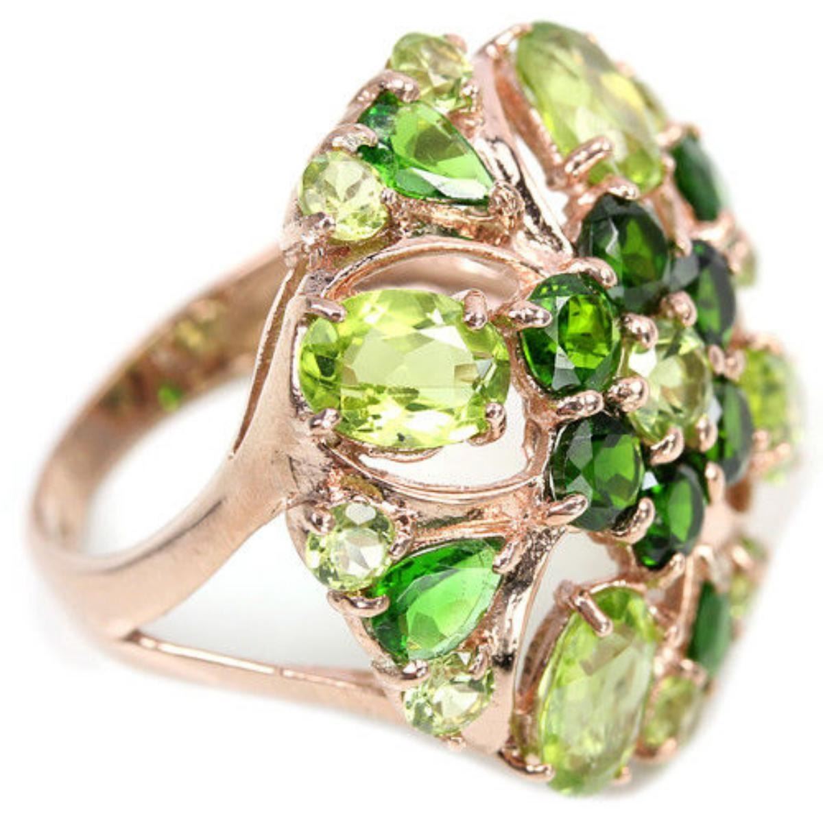 NATURAL GREEN CHROME DIOPSIDE & PERIDOT 925 SILVER RING 14K PINK GOLD COATING;RING SIZE7.00 ( can be resized )ITEM QUANTITY1STONE SHAPEMIXED SHAPESTONE DIMENSION7 X 5 MM. , 5 X 4 MM. , 4 MM. & 3 MM.ITEM WEIGHT6.5 GRAMCOLORGREEN & APPLE GREENCLARITYIF, VVS - VSLUSTERDAZZLINGTREATMENTUNHEATEDORIGIN OF STONEAFRICA & ASIAHARDNESS6.5 - 7FACE OF RING 25 X 25 MM.