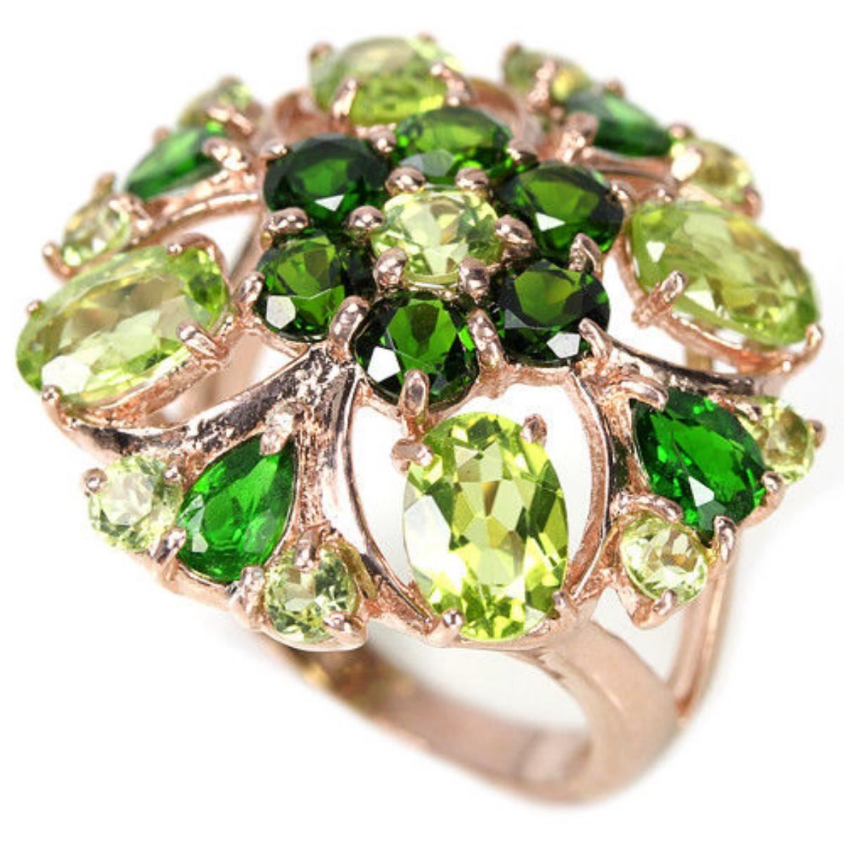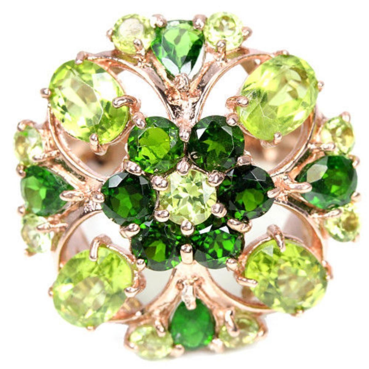 NATURAL GREEN CHROME DIOPSIDE & PERIDOT 925 SILVER RING 14K PINK GOLD COATING;RING SIZE7.00 ( can be resized )ITEM QUANTITY1STONE SHAPEMIXED SHAPESTONE DIMENSION7 X 5 MM. , 5 X 4 MM. , 4 MM. & 3 MM.ITEM WEIGHT6.5 GRAMCOLORGREEN & APPLE GREENCLARITYIF, VVS - VSLUSTERDAZZLINGTREATMENTUNHEATEDORIGIN OF STONEAFRICA & ASIAHARDNESS6.5 - 7FACE OF RING 25 X 25 MM.