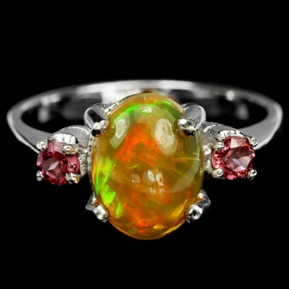 Total Carat Weight (TCW):10.95Metal Purity:925 parts per 1000Main Stone Treatment:Not EnhancedSizable:YesSecondary Stone:Rhodolite GarnetMetal:Sterling Silver with 14k white gold plated;Main Stone:White/Precious OpalsMain Stone Shape:CabochonMain Stone Color:WhiteTotal Carat Weight:1.50Ring Size:5.5(resizeable)MAIN STONE SIZE:9 X 7.1 X 4.2 MM.