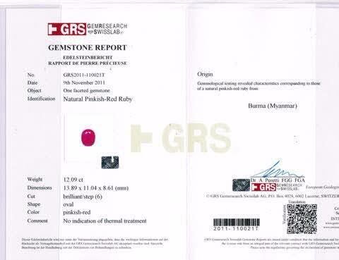 Natural Old Mine Burma Ruby 12.09 Carats....no treatment in any way; Certfied by GRS swiss lab;