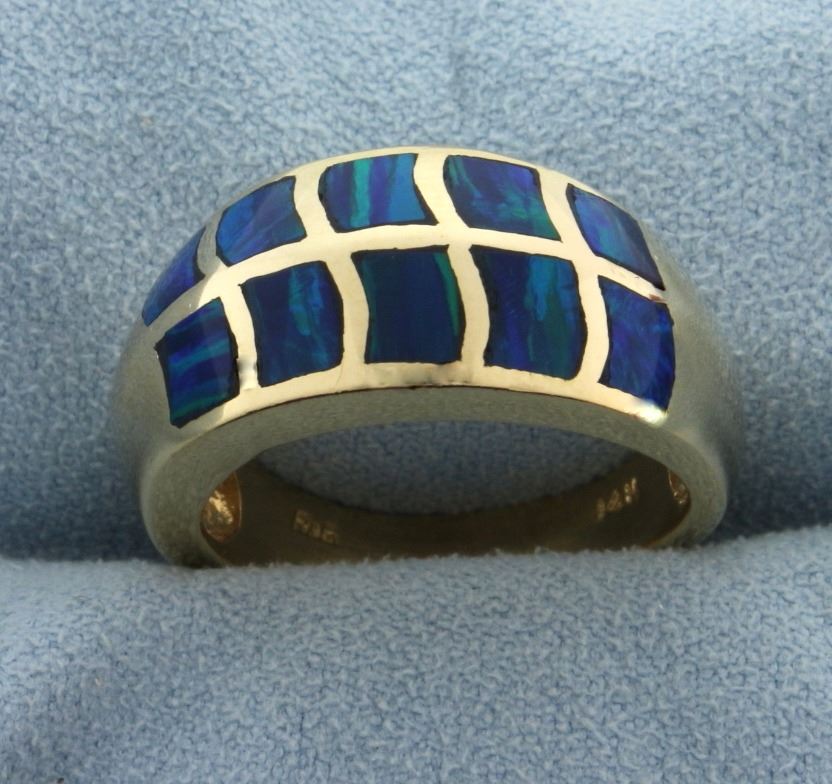 In 14k Yellow Gold. Ten Opal Gemstones with beautiful play of color in greens and blue. The width across top is 11mm (3/8") and Tapers to 4.25mm. Size 9 1/2. 10.5g