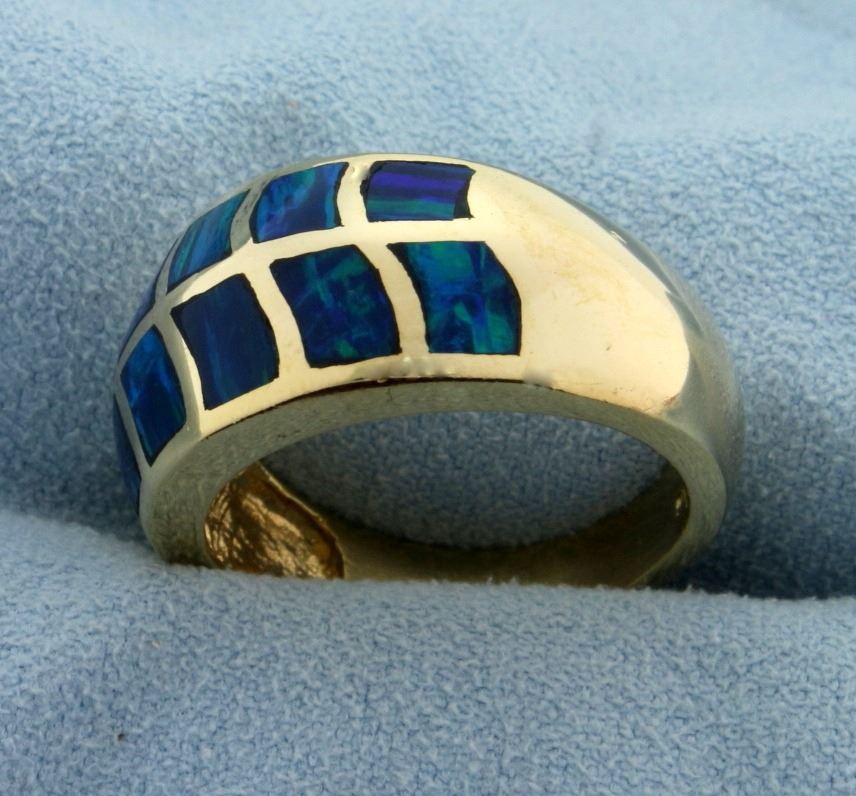 In 14k Yellow Gold. Ten Opal Gemstones with beautiful play of color in greens and blue. The width across top is 11mm (3/8") and Tapers to 4.25mm. Size 9 1/2. 10.5g