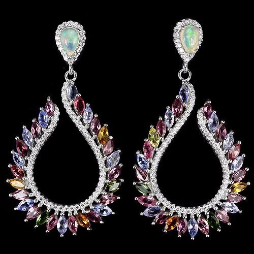 RAINBOW OPAL TOURMALINE,TANZANITE & CZ 925 SILVER EARRING 14K WHITE GOLD COATING; STONE SHAPEPEAR CABOCHON CUT & MARQUISE PORTUGUESE CUT;STONE DIMENSION-6 X 4 MM. , 4 X 2 MM.;ITEM WEIGHT-11 GRAM;COLOR-MULTI COLOR;ORIGIN OF STONE-AFRICA & TANZANIA;HARDNESS-5.5 - 7.5;OTHERFACE OF EARRING 45 X 24 MM. ;WHITE CUBIC ZIRCONIA 1 MM.