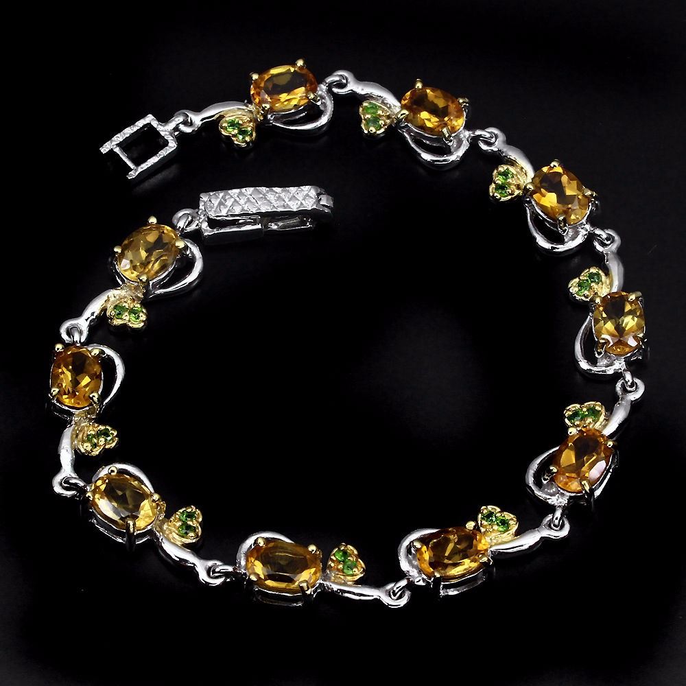 925 STERLING SILVER;PLATE-2-TONE WHITE YELLOW 14K GOLD;LENGTH (INCHES)-7.5;MAIN STONE-CITRINE;OTHER GEMS-CHROME DIOPSIDE;TOTAL WEIGHT-65.04 CT (TOTAL WEIGHT OF SILVER + STONE)DIMENSION* STONE 1.5 TO 7.0 X 5.0 MM. * FACE BRACELET 165.0 X 8.0 MM.MAIN STONE SHAPE-OVAL CUT;MAIN STONE COLOR-TOP RICH YELLOW;CLARITY/GRADE-IF TO VVS;TREATMENT-UNHEATED;ORIGIN-BRAZIL;HARDNESS-5.0 - 7.5