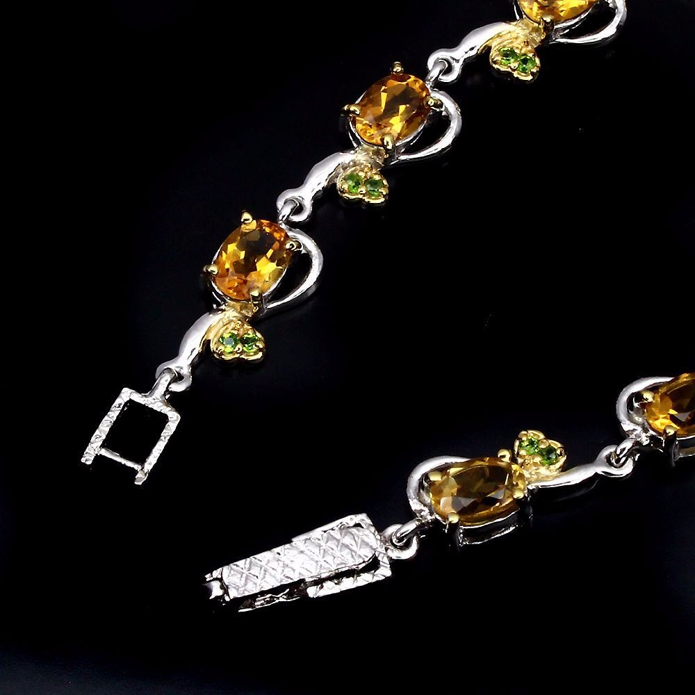 925 STERLING SILVER;PLATE-2-TONE WHITE YELLOW 14K GOLD;LENGTH (INCHES)-7.5;MAIN STONE-CITRINE;OTHER GEMS-CHROME DIOPSIDE;TOTAL WEIGHT-65.04 CT (TOTAL WEIGHT OF SILVER + STONE)DIMENSION* STONE 1.5 TO 7.0 X 5.0 MM. * FACE BRACELET 165.0 X 8.0 MM.MAIN STONE SHAPE-OVAL CUT;MAIN STONE COLOR-TOP RICH YELLOW;CLARITY/GRADE-IF TO VVS;TREATMENT-UNHEATED;ORIGIN-BRAZIL;HARDNESS-5.0 - 7.5