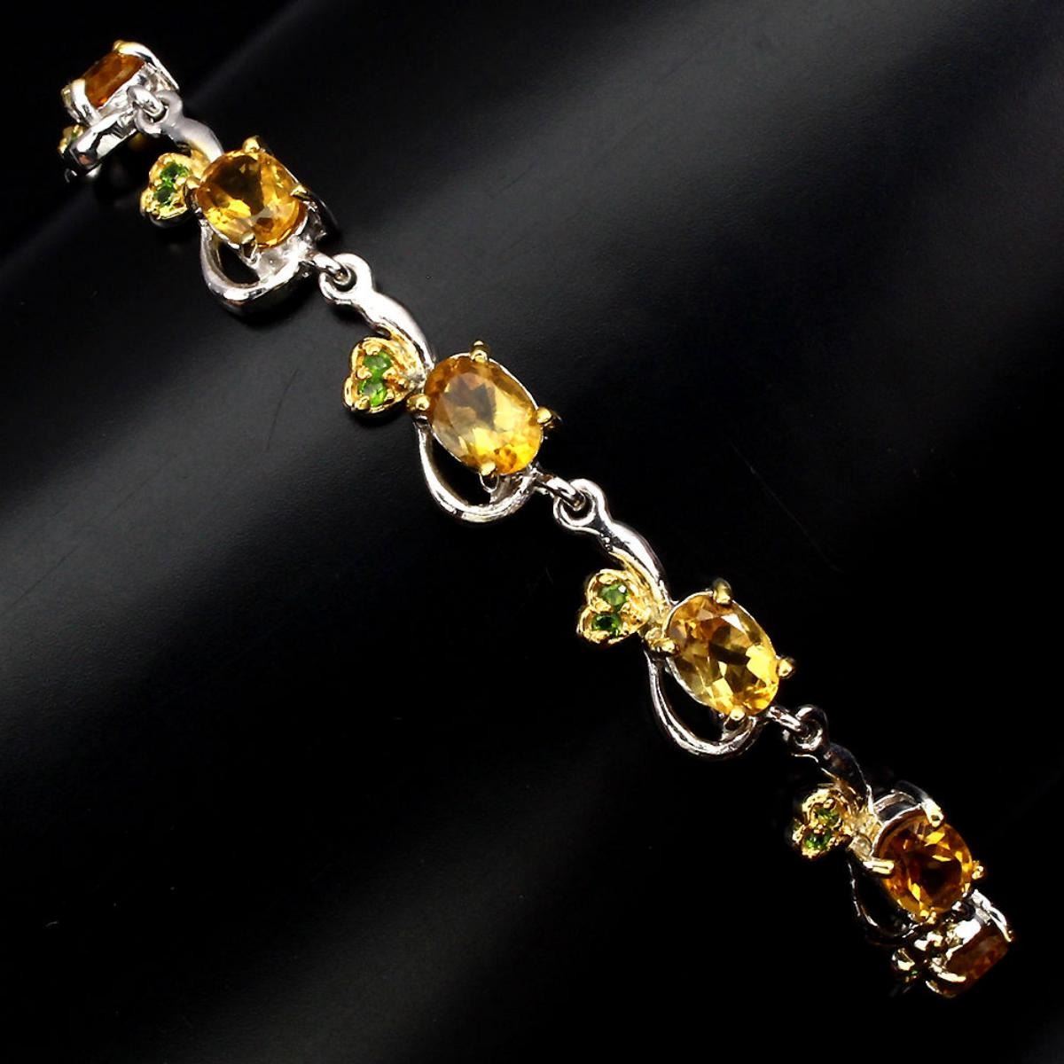 925 STERLING SILVER;PLATE-2-TONE WHITE YELLOW 14K GOLD;LENGTH (INCHES)-7.5;MAIN STONE-CITRINE;OTHER GEMS-CHROME DIOPSIDE;TOTAL WEIGHT-65.04 CT (TOTAL WEIGHT OF SILVER + STONE)DIMENSION* STONE 1.5 TO 7.0 X 5.0 MM. * FACE BRACELET 165.0 X 8.0 MM.MAIN STONE SHAPE-OVAL CUT;MAIN STONE COLOR-TOP RICH YELLOW;CLARITY/GRADE-IF TO VVS;TREATMENT-UNHEATED;ORIGIN-BRAZIL;HARDNESS-5.0 - 7.5