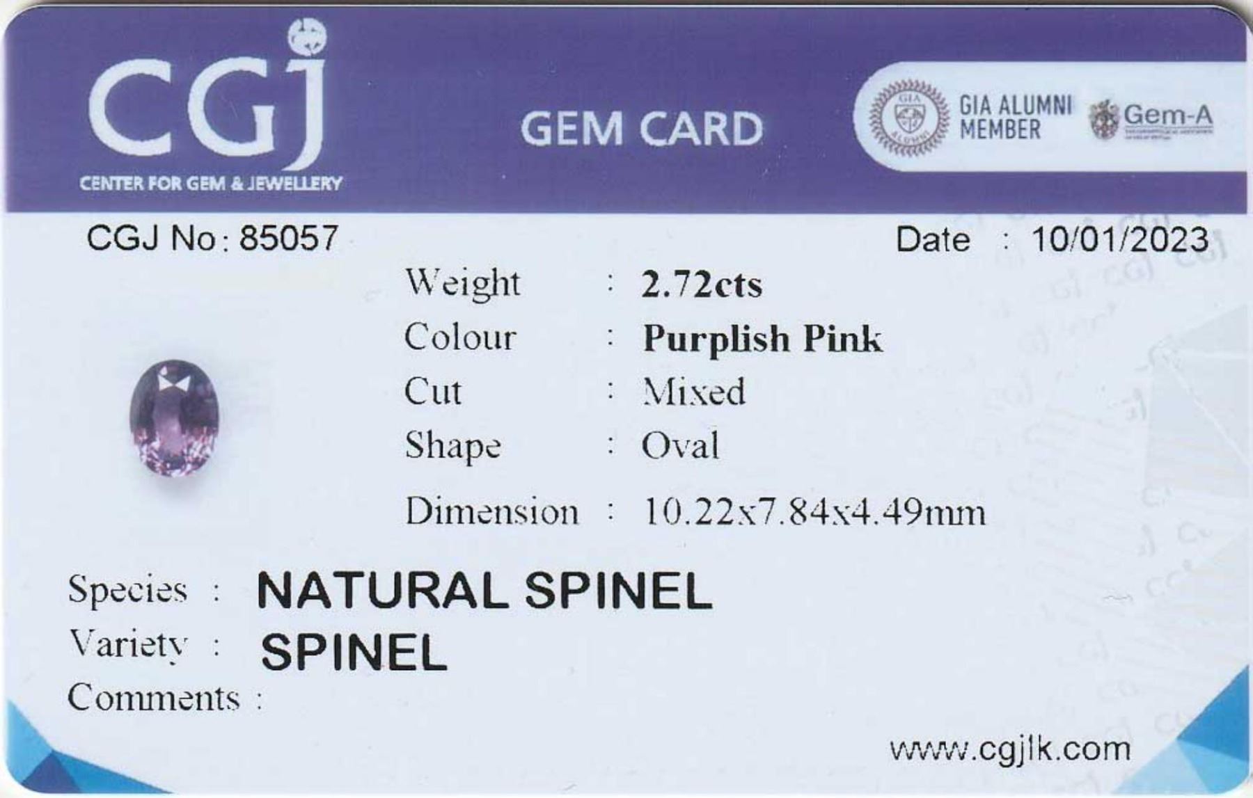 Natural Oval Pink Spinel 2.72 Cts ; size 10.22 x 7.84 x 4.49 MM; Color Purple/Pink; Origin - Sri Lanka;