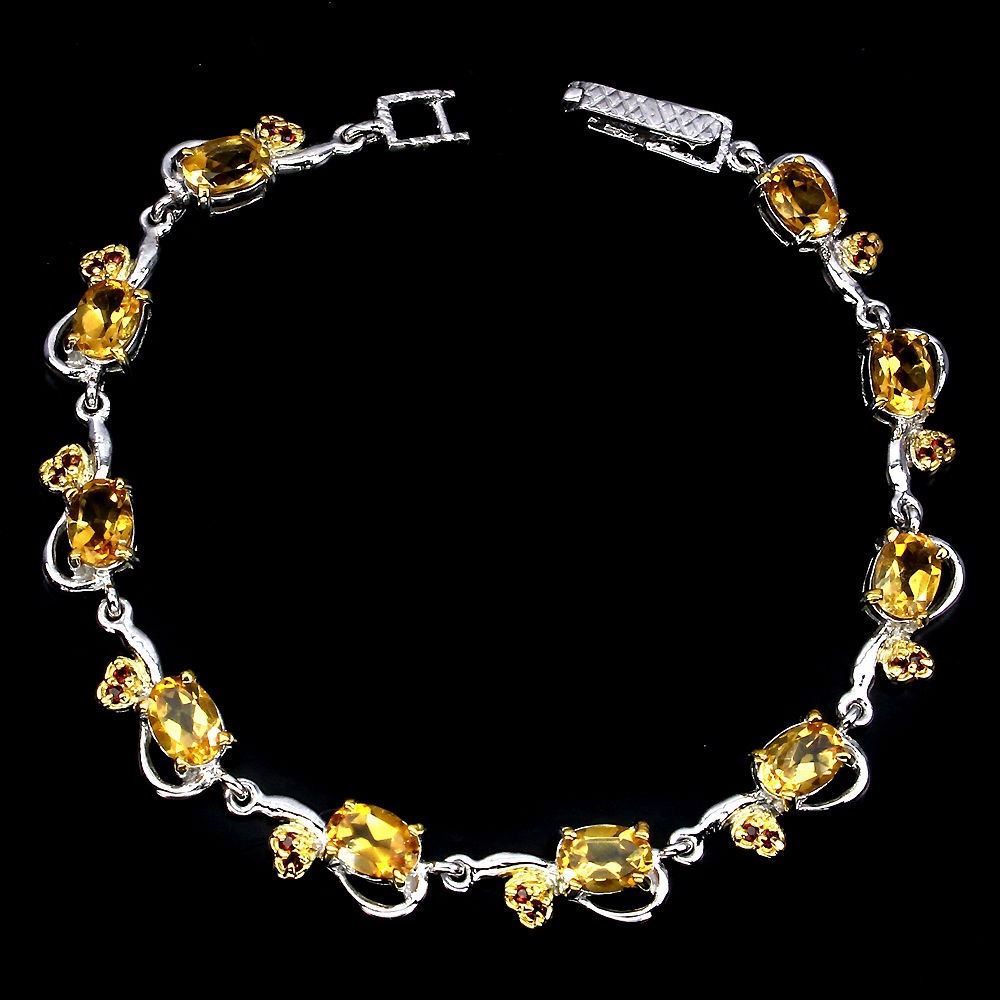 925 STERLING SILVER;PLATE-2-TONE WHITE YELLOW 14K GOLD;LENGTH (INCHES)-7.5;MAIN STONE-CITRINE;OTHER GEMS-MOZAMBIQUE GARNET;TOTAL WEIGHT-64.14 CT (TOTAL WEIGHT OF SILVER + STONE)DIMENSION* STONE 1.0 TO 7.0 X 5.0 MM. * FACE BRACELET 165.0 X 7.0 MM.;MAIN STONE SHAPE-OVAL CUT;MAIN STONE COLOR-TOP RICH YELLOW;CLARITY/GRADE-IF TO VVS;LUSTER-GLORIOUS;TREATMENT-UNHEATED;ORIGIN-BRAZIL;HARDNESS-7