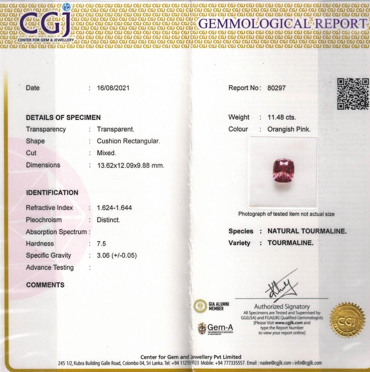 Natural Padparadscha Tourmaline 11.60 Ct{VVS}....Cushion Cut; Origin - Mozambique; Completely untreated, natural earth mined ; Certified