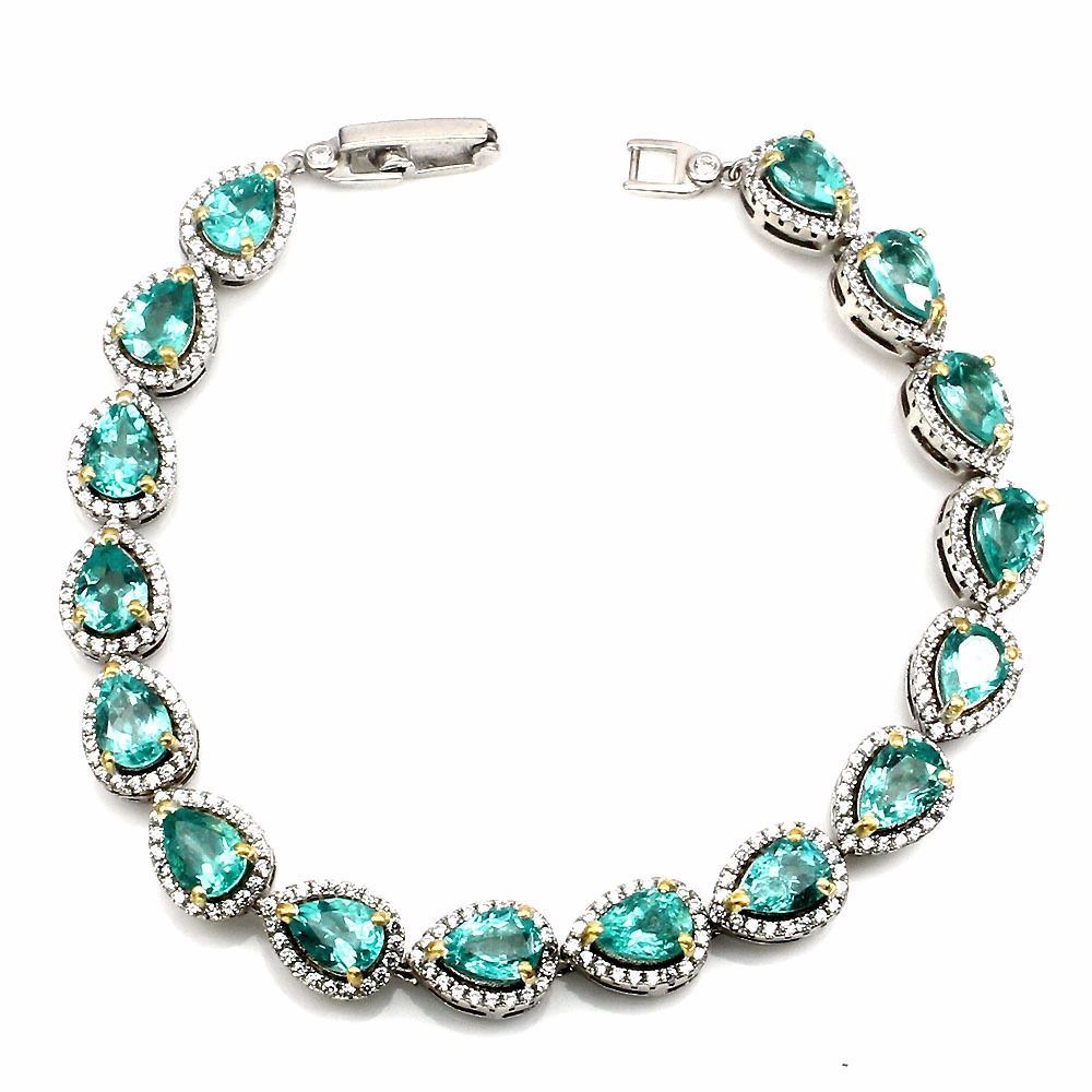 925 STERLING SILVER;PLATE-2-TONE WHITE YELLOW 14K GOLDLENGTH (INCHES)7;MAIN STONE-APATITE;OTHER GEMS-CUBIC ZIRCONIA;TOTAL WEIGHT-92.70 CT (TOTAL WEIGHT OF SILVER + STONE)DIMENSION* STONE 6.0 X 4.0 MM. * CZ 1.0 TO 1.5 MM. * FACE BRACELET 164.0 X 8.0 MM.;MAIN STONE SHAPE-PEAR CUT;MAIN STONE COLOR-TOP NEON BLUE;CLARITY/GRADE-IF TO VVS;TREATMENT-UNHEATED;ORIGIN-Madgascar;HARDNESS-5