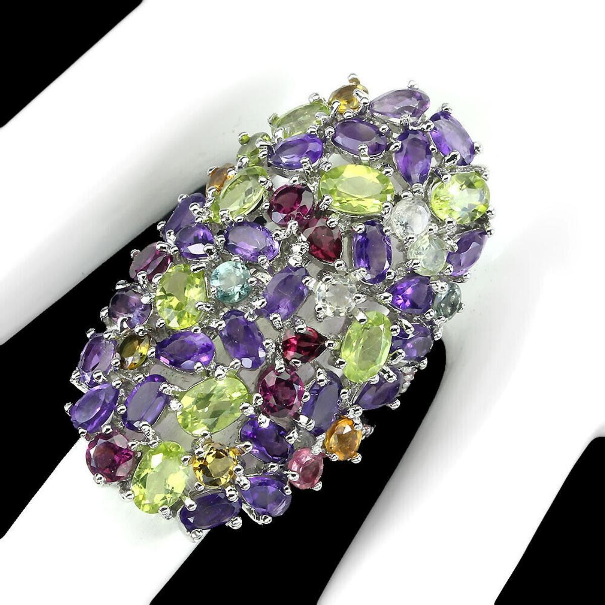 925 STERLING SILVER;PLATE-14K WHITE GOLD;RING SIZE-9(RESIZABLE);MAIN STONE-PERIDOT;OTHER GEMS-AMETHYST, RHODOLITE GARNET, TOURMALINE;TOTAL WEIGHT-12.81 GRAM (TOTAL WEIGHT OF SILVER + STONE);DIMENSION-* STONE 1.5 TO 6.0 X 4.0 MM.* RING SIZE 9.0* FACE RING 42.0 X 25.0 MM.;MAIN STONE SHAPE-OVAL ;MAIN STONE COLORGREEN;CLARITY/GRADE-IF TO VVS;TREATMENT-UNHEATED;ORIGIN-PAKISTAN;HARDNESS-6.5 - 7.0;