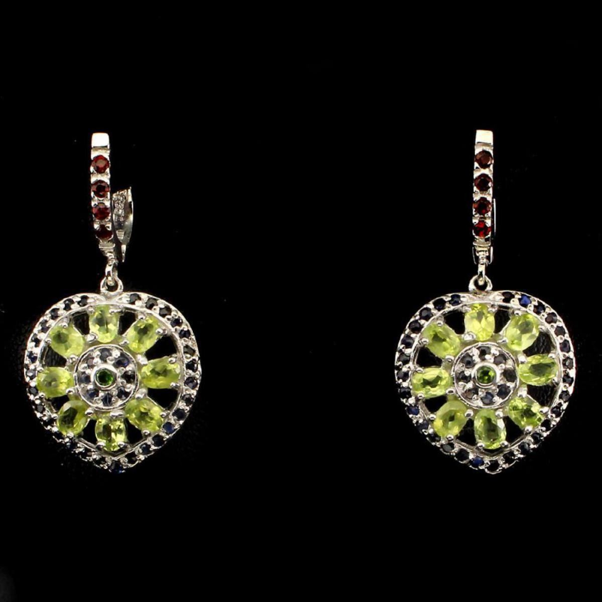 925 STERLING SILVER;PLATE-14K WHITE GOLD;MAIN STONE-PERIDOT;OTHER GEMS-CHROME DIOPSIDE,MOZAMBIQUE GARNET,SAPPHIRE;TOTAL WEIGHT-42.73 CT (TOTAL WEIGHT OF SILVER + STONE);DIMENSION* STONE 1.5 TO 4.0 X 3.0 MM. * FACE EARRINGS 35.0 X 18.0 MM.;MAIN STONE SHAPE-OVAL CUT;MAIN STONE COLOR-TOP RICH GREEN;CLARITY/GRADE-IF TO VVS;TREATMENT-UNHEATED;ORIGIN-PAKISTAN;HARDNESS-5.0 - 9.0