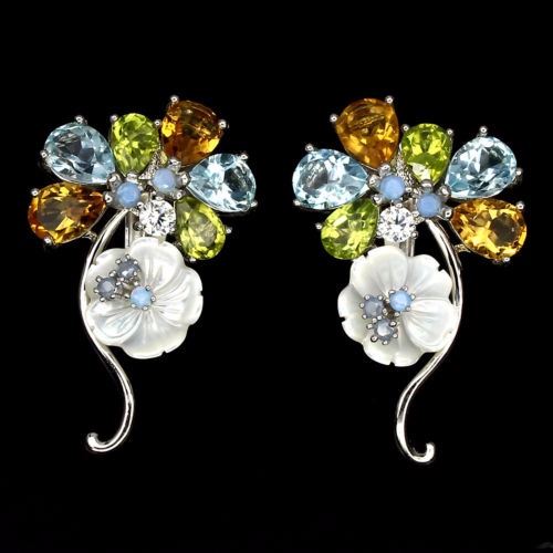 925 STERLING SILVER;PLATE-14K WHITE GOLD;MAIN STONE-PERIDOT;OTHER GEMS-CITRINE,CUBIC ZIRCONIA,DYED OPAL,MOTHER OF PEARL,SKY ;BLUE TOPAZ;TOTAL WEIGHT38.89 CT (TOTAL WEIGHT OF SILVER + STONE)DIMENSION* STONE 1.5 TO 7.0 X 5.0 MM. * MOP 10.0 MM. * CZ 3.0 MM. * FACE EARRINGS 30.0 X 17.0 MM.;MAIN STONE SHAPE-PEAR CUT;MAIN STONE COLOR-TOP RICH GREEN;CLARITY/GRADEIF TO VVS;LUSTERBEAUTEOUS;TREATMENT-UNHEATED;ORIGINPAKISTAN;HARDNESS3.5 - 7.0