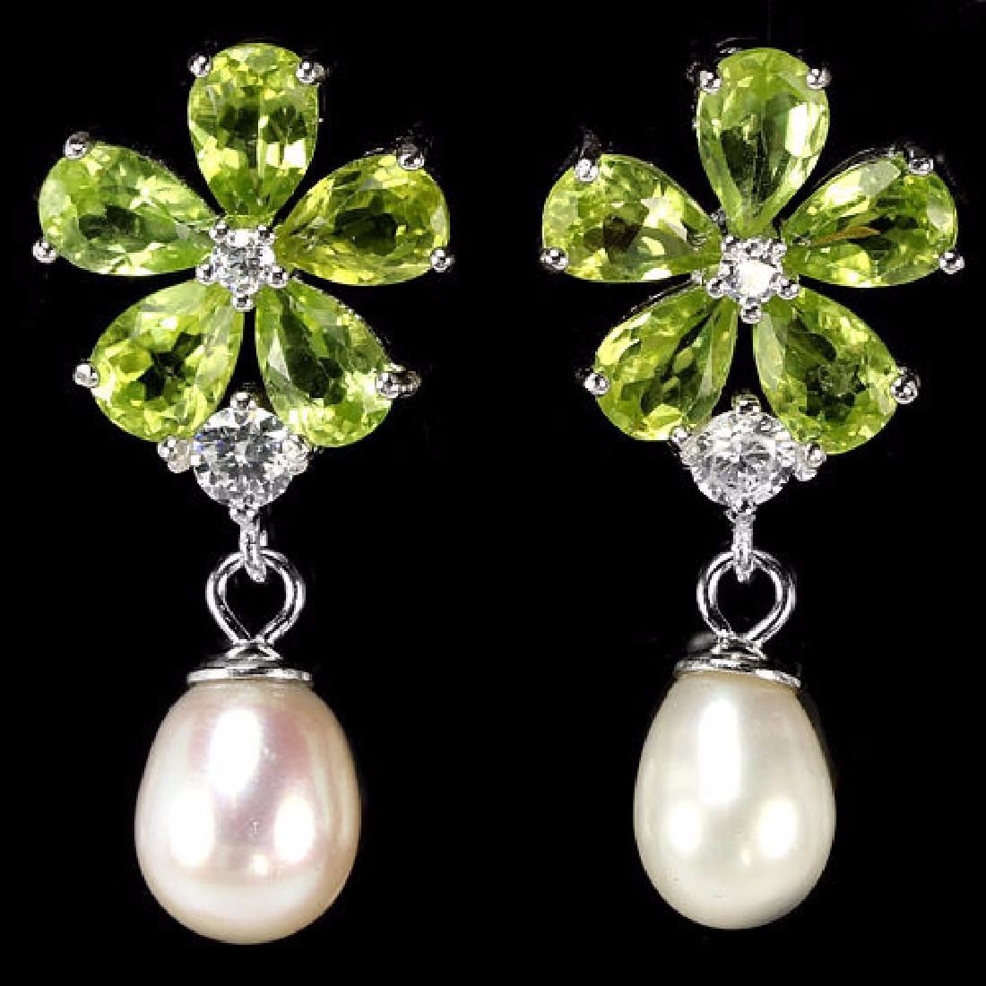 NATURAL GREEN PERIDOT, PEARL WHITE CZ 925SILVER EARRING 14K WHITE GOLD COATING; STONE SHAPE-PEAR PORTUGUESE CUT OVAL CABOCHON CUT;STONE DIMENSION-8 X 6 MM. 6 X 4 MM.;ITEM WEIGHT-4.9 GRAM;COLOR-GREEN WHITE;CLARITY-VVS-VS OPAQUSE;LUSTER-DAZZLING;TREATMENT-UNHEATED;ORIGIN OF STONE-Japan Pakistan;HARDNESS-6.5;FACE OF EARRING -28 X 13 MM.; WHITE CUBIC ZIRCONIA -3 MM. 2 MM.