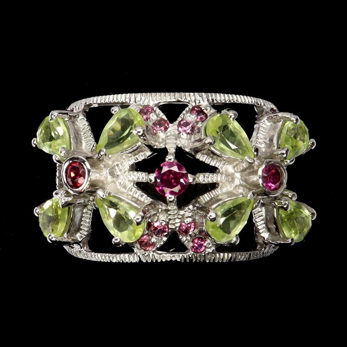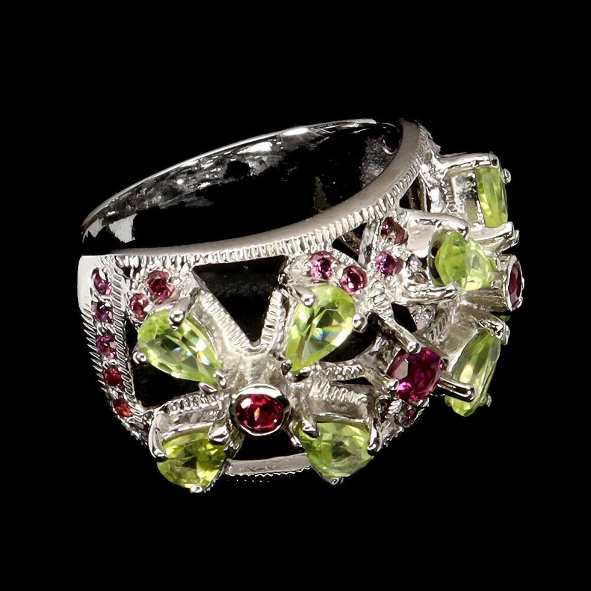 925 STERLING SILVER;PLATE-14K WHITE GOLD;RING SIZE-7(RESIZABLE);MAIN STONE-PERIDOT;OTHER GEMS-RHODOLITE GARNET;TOTAL WEIGHT-7.76 GRAM (TOTAL WEIGHT OF SILVER + STONE);DIMENSION-* STONE 1.0 TO 5.0 X 3.0 MM.* RING SIZE 7.0* FACE RING 25.0 X 15.0 MM.;MAIN STONE SHAPE-PEAR ;MAIN STONE COLOR-GREEN;CLARITY/GRADE-IF TO VVS;TREATMENT-UNHEATED;ORIGIN-PAKISTAN;HARDNESS-6.5 - 7.0;