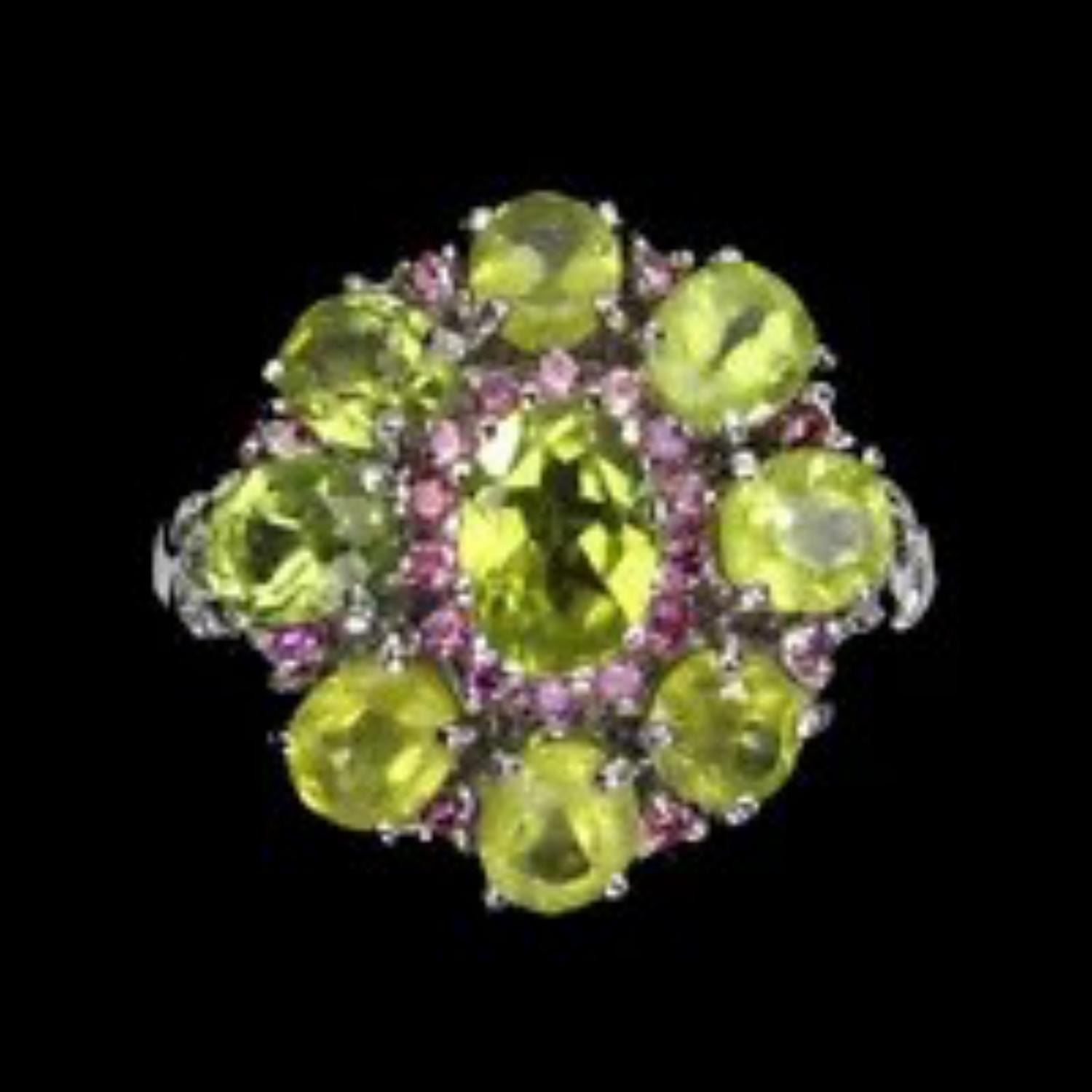 925 STERLING SILVER;PLATE-14K WHITE GOLD;RING SIZE-8.00;MAIN STONE-PERIDOT;OTHER GEMS-RHODOLITE GARNET;CLARITY/GRADE-IF TO VVS;TREATMENT-UNHEATED;ORIGIN-PAKISTAN;HARDNESS-6.5 - 7.0;